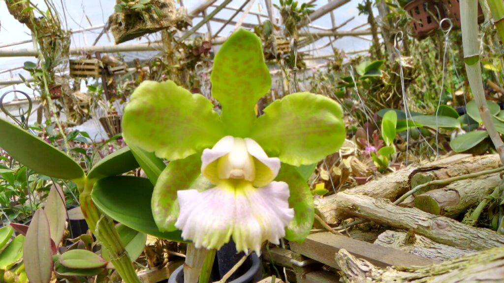 O exemplar polinizado tem ótima forma, pétalas e sépalas largas e harmônicas, labelo em tons branco e róseo claro que contrasta com o verde-claro e suas pigmentações verde-musgo, uma verdadeira joia.