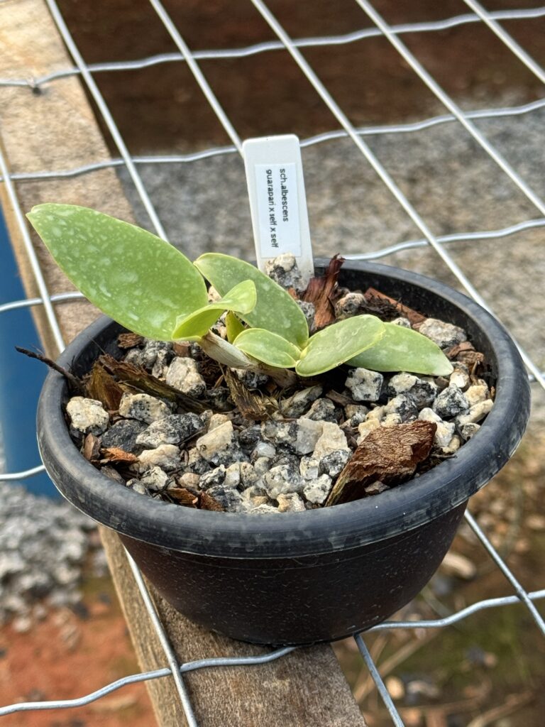 Descrição do cruzamento: Este cruzamento se trata de um self da genética albescens (guarapari x self), fruto da autofecundação artificial do cruzamento entre duas plantas nativas ((labelão nt x zé modolo nt) x self) que surpreendeu os colecionadores Sávio e Keko Caliman ao revelar uma variedade cromática inédita da espécie.
